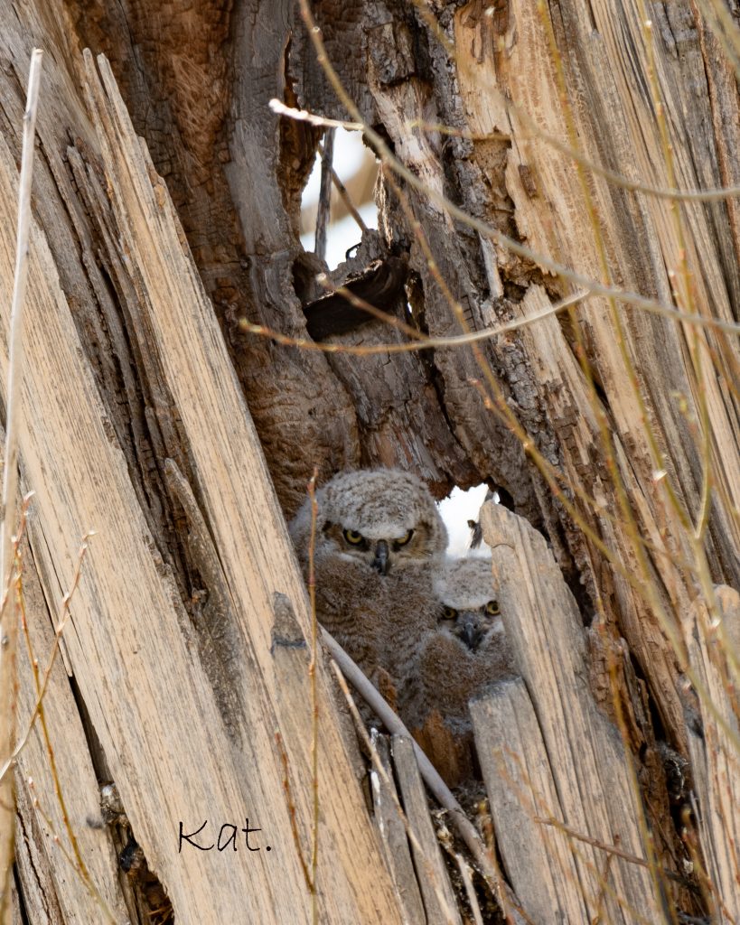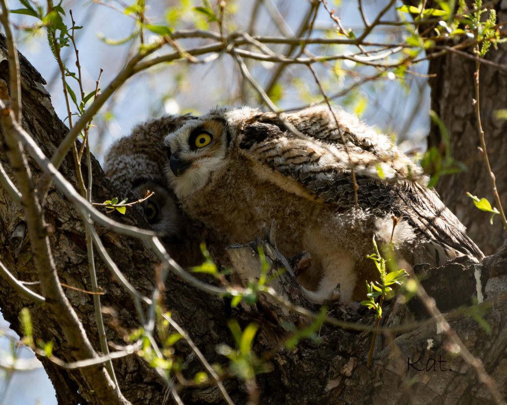 Young Great-horned Owls. No, it’s not playing Dracula. It’s just looking over the back of its sibling!